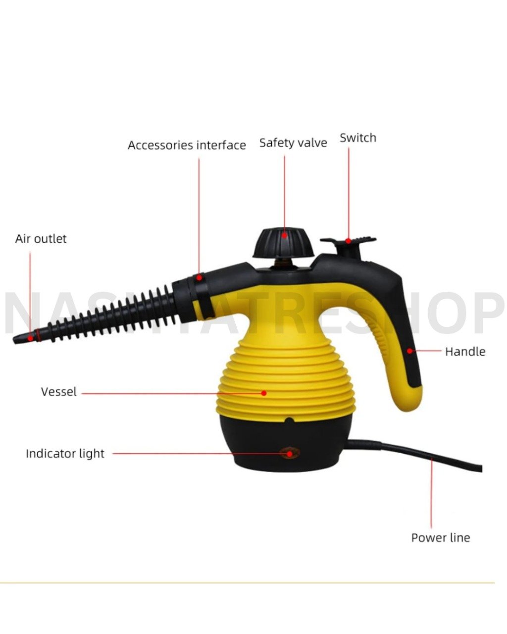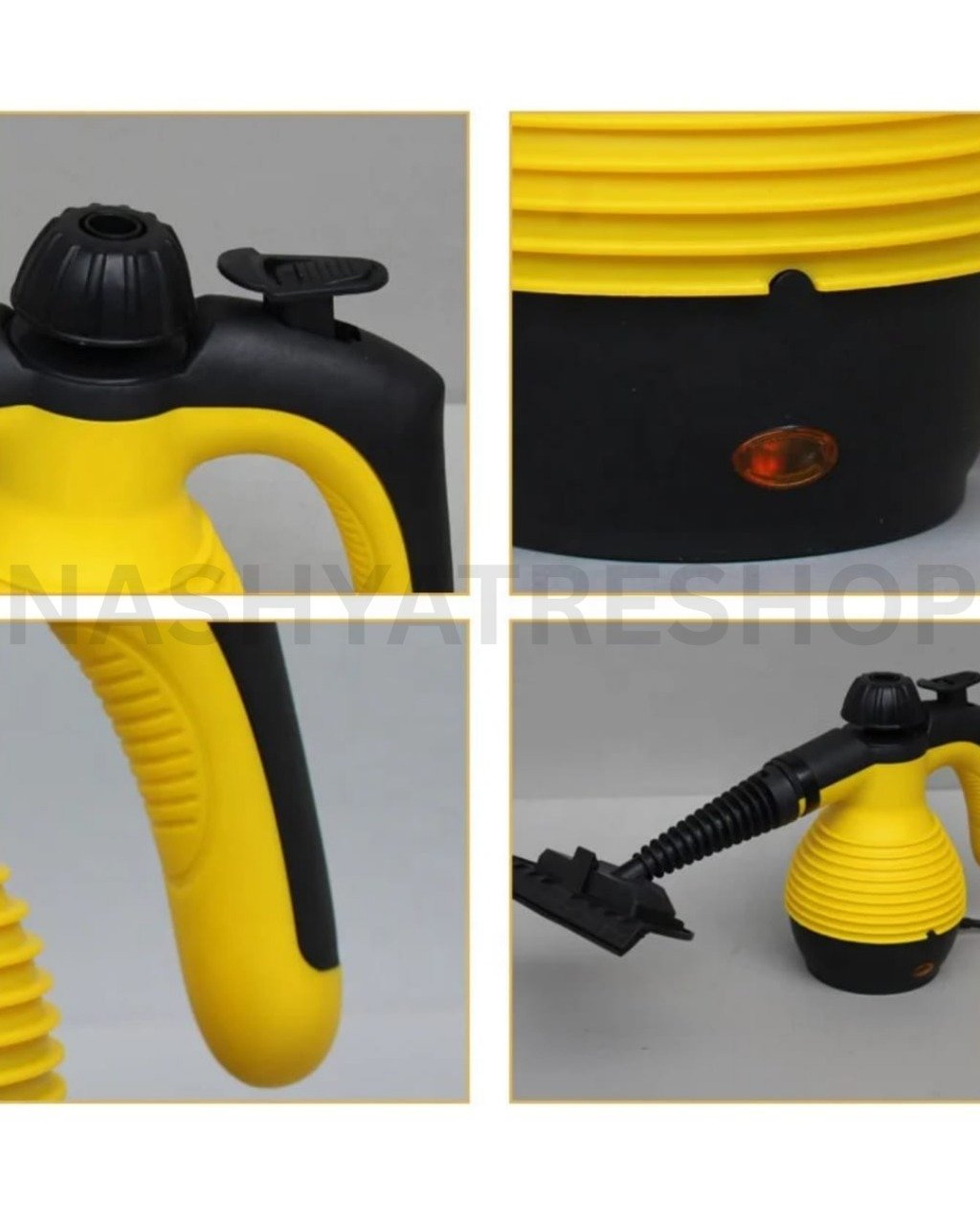 A powerful and compact handheld steam cleaner designed for deep cleaning and sanitizing without chemicals. It delivers high-pressure steam that removes grease, stains, and dirt from kitchens, bathrooms, floors, windows, carpets, upholstery, and more. Comes with multiple attachments including a bent spray nozzle, an extended round brush, a long spray nozzle, and a towel sleeve to cover all cleaning needs.